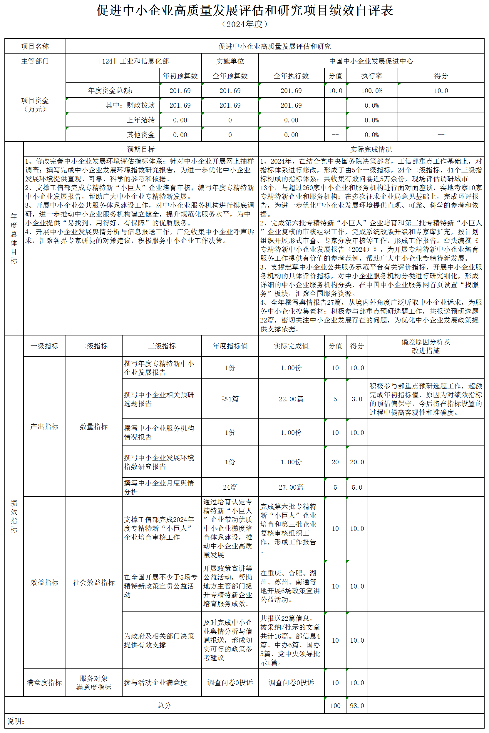 2024年度中心2個財政項目設置13個績效目標,項目績效目標及財政資金支付全部完成。“促進中小企業(yè)高質(zhì)量發(fā)展評估和研究”項目支出201.69萬元,9個績效目標全部完成;“東盟與中日韓(10+3)中小企業(yè)服務聯(lián)盟能力建設2024——促進中小企業(yè)綠色發(fā)展”項目支出50萬元,4個績效目標全部完成。